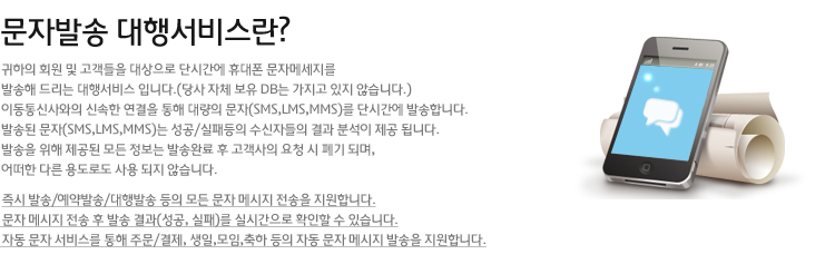 ※ 1회 2만 건 이상(LMS/MMS) 또는 3만 건 이상(SMS)대량 문자 발송 시 연락 주시면 단가 조정이 가능합니다.